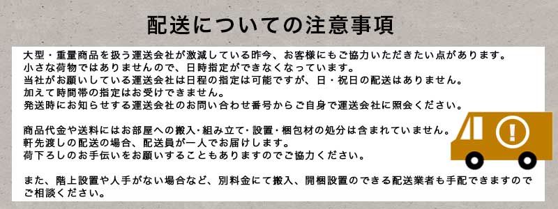 | 【配送について】 | 玄関渡しが条件の送料設定となります。 大型商品・重量物の場合、人手のない方や、階段で階上への搬入が必要な場合などは、別料金にて部屋までの搬入・開梱組み立て設置を承りますので、注文前にご相談ください。 |